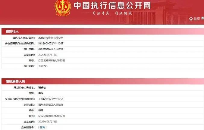 据中国执行信息公开网显示,近日,因未按执行通知书指定的期间履行生效法律文书确定的给付义务,永辉超市股份有限公司及其法定代表人张轩松被限制高消费。此案件申请人为郑州市唐科废旧物资回收有限公司,涉及服务合同纠纷案件,该案立案时间为2025年5月13日。此前,永辉超市股份有限公司已因此案被执行39万余元。